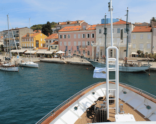 Meer endet an sanften grünen Hügeln mit einer kleinen Stadt. In schönster Abendsonne steuern wir auf Mali Losinj zu. Schon mehrere Minuten fährt das Schiff in der ruhigen Bucht, ein natürlicher Hafen, vom Wind geschützt und rund fünf Kilometer lang. Flankiert von anderen, kleineren Booten und Schiffen, gleiten wir langsam vorwärts. Wie ein Magnet zieht der helle Fleck die Schiffe an, lockt sie mit hypnotischer Anziehungskraft ans Ende der Bucht. Dorthin, wo sich die Stadt ans Meer schmiegt, es einrahmt mit einer gepflegten Häuserzeile und einer palmengesäumten Promenade. Die Fahrt war fast meditativ, jetzt herrscht plötzlich Betriebsamkeit. Während sich die Gäste auf der Excellence Adria noch wundern, ob die Lücke zwischen einem Segelschiff und einer anderen eindrücklichen Yacht wirklich reicht für ihr schwimmendes Hotel, werden schon die Taue ausgeworfen. In kürzester Zeit ist das Schiff seitlich einparkiert. Die kleine Brücke wird ausgefahren und wir stehen mitten in der Flaniermeile, mitten in der Stadt, mitten im Geschehen. Dort nehmen nicht nur die Neuankömmlinge die schöne Umgebung wahr, sondern auch Passanten die schöne Excellence Adria.